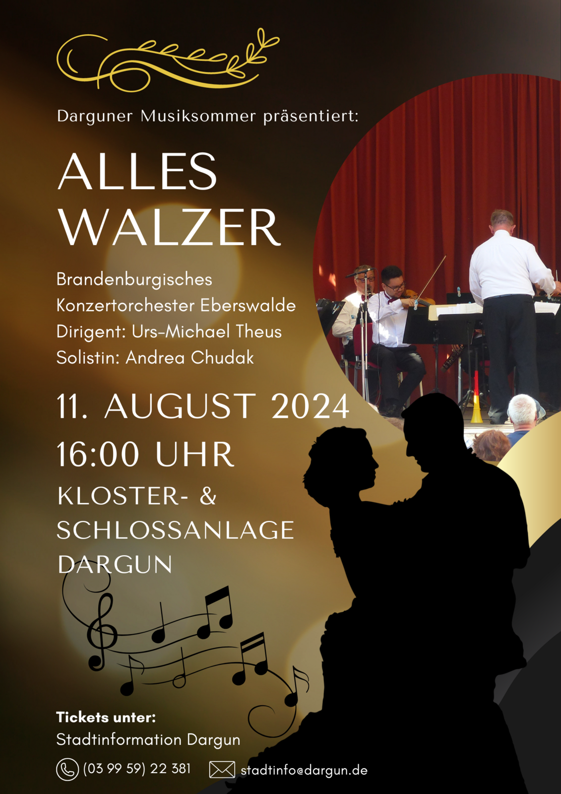 Zu einem Konzert unter dem Motto „Alles Walzer“ lädt das Brandenburgische Konzertorchester Eberswalde am Sonntag, den 11. August 2024 um 16:00 Uhr in die Kloster- und Schlossanlage Dargun ein. Neben berühmten Melodien und konzertanten Stücken der großen Operettenmeister Joseph Lanner, Emmerich Kálmán, Johann Strauß und Franz Lehár steht der in Wien seit fast 200 Jahren überaus beliebte und gefeierte Walzer im Mittelpunkt des Programms. Dazu präsentiert die charmante Solistin Andrea Chudak (Sopran) walzerselige Melodien wie „Il Bacio - Kusswalzer“ und „Ach wir armen Primadonnen“. Trotz Tanztrends von Salsa bis Tango schlagen viele Herzen immer noch im Dreivierteltakt.Bleibt uns nur zu sagen: "Alles dreht sich im Walzertakt!" – wir sehen uns in Dargun!
