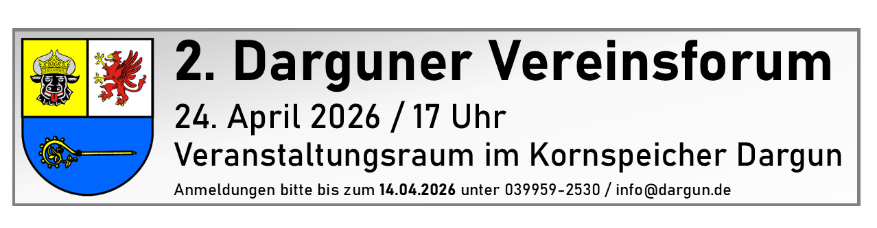 Am 24.04.2026 soll das 2. Darguner Vereinsforum im Kornspeicher der Kloster- und Schlossanlage Dargun stattfinden, zu dem Interessierte herzlich eingeladen sind.