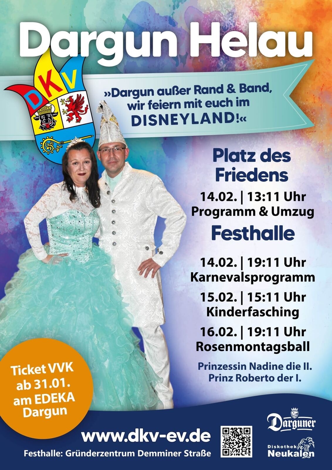 Der Kartenvorverkauf für die Abendveranstaltungen, startet am Samstag, 31.01.2026 durch den DKV am Edeka in Dargun und läuft dann bis zum 12.02.2026, für den Kinderfasching am Sonntag wird es nur eine Tageskasse geben. Schnell sein lohnt sich, die Tickets im Vorverkauf sind günstiger als an der Abendkasse. Ob es für Samstag überhaupt noch eine Abendkasse geben wird, hängt von den Vorverkaufszahlen ab.